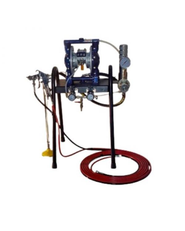 Equipo doble membrana Green-Air GR-24R sobre bastidor con filtro de línea, sistema de aspiración, equipo doble regulación de aire, pistola GR-71E con paso a elegir y 7,5m de manguera de pintura y aire.