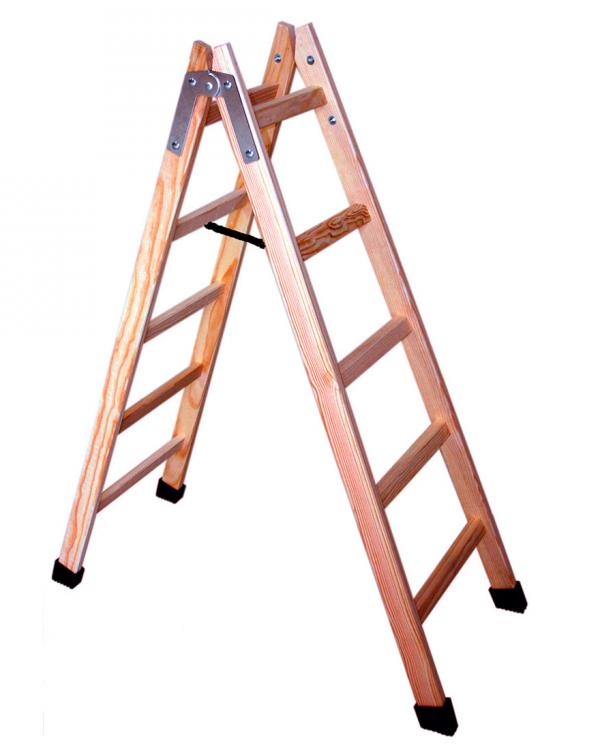 Escalera de doble subida con sistema antiapertura y tacos de goma antideslizante. Fabricada en su totalidad con madera de pino. Segura y cómoda a un precio competitivo. Peldaño al canto o peldaño plano.