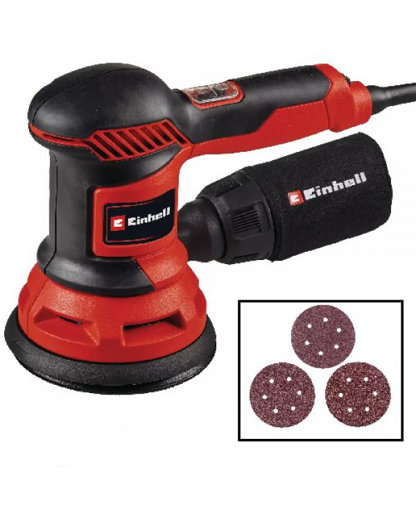 La lijadora excéntrica TC-RS 425 E de Einhell es un equipo potente y robusto, que se usa en todo lugar donde no solo se lijan superficies rectas, sino también no rectas de madera, materiales derivados de la madera o superficies pintadas. Con la electrónica de regulación de velocidad, su potencia de lijado puede adaptarse óptimamente al material a mecanizar y la tarea respectiva. Así la lijadora excéntrica convence con alta remoción y lijado fino. La potente TC-RS 425 E de 425 W está equipada con un gran disco de lija de 125 mm con micro-velcro, de modo que pueden cambiarse papeles de lija en segundos y se aplican sin pliegues en la placa de lija. La lijadora excéntrica trabaja con una gran círculo oscilante de 2,5 mm y nº de vibraciones entre 12000 y 26000 por minuto. Debido a las superficies de agarre ergonómicas con agarre suave y la empuñadura adicional se garantiza una manipulación cómoda en usos de trabajo más prolongados. Para el trabajo limpio con poco polvo, el equipo dispone de una aspiración de polvo integrada con bolsa colectora de polvo y de un adaptador de aspiración de 35 mm, en el que se puede conectar, por ejemplo, un aspirador en seco-húmedo. El cable de red de 2 metros ofrece un gran radio de acción. Incl. papeles de lija (1 P60, 1 P80, 1 P120)