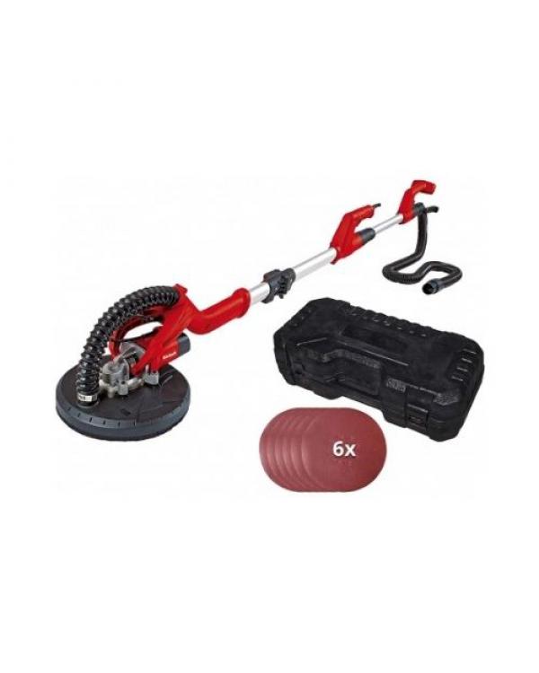 La pulidora de obra seca TC-DW 225 de Einhell es un ayudante práctico y universal en el acabado interior y en la renovación para cada aficionado al bricolaje exigente. Gracias al potente motor de 600 W con engranaje angular de metal de alto valor, se consiguen de forma rápida y sin esfuerzo todas las tareas de pulido en los trabajos de obra en seco, como por ejemplo, el alisado de las paredes y techos, así como la retirada de los restos de tapetes, pintura, enlucido suelto, etc. En el gran plato con diámetro de 225 mm se puede montar y cambiar de forma sencilla los discos abrasivos mediante el práctico sistema de hook and loop. La adaptación óptima de la velocidad de pulido a distintos fondos a mecanizar se puede ajustar de forma rápida y sencilla mediante la regulación del número de revoluciones. Para los mejores resultados y el trabajo cómodo, esta pulidora en seco está equipada de un mango telescópico hasta 165 cm de longitud y un asa en T ergonómica, a fin de poder trabajar sin esfuerzo también durante el mecanizado del techo. Adicionalmente una rótula y el apoyo por resorte de la corona de escobillas proporciona una movilidad ilimitada del cabezal de pulido, a fin de posibilitar también un radio de acción lo mayor posible durante el trabajo sobre, por ejemplo, escaleras. El polvo que se produce se aspira mediante un práctico sistema de aspiración en conexión con un equipo de aspiración adicional (aspirador en seco) directamente del disco abrasivo y por consiguiente posibilita en todo momento un puesto de trabajo limpio sin molesta desprendimiento de polvo. Después del trabajo o en caso de breve interrupción del trabajo, el equipo se puede depositar gracias al pie de apoyo estable sin que se tuerza el tubo flexible de aspiración. El mango de guiado del equipo de pulido está realizado de forma plegable para el montaje y desmontaje rápido, así como almacenamiento ahorrando espacio. El suministro se realiza en el práctico maletín de transporte y almacenamiento, inclusive 6 discos abrasivos con respectivamente Ø225 mm y granulados de P60, P80 y P120 (cada vez 2 piezas por granulado) para el inicio inmediato del proyecto.